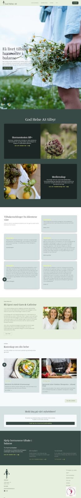 God Helse AS har fått en nettside som gjør det enkelt for kundene å finne informasjon om tjenestene de tilbyr. Guro, som holder i mye av det administrative, melder om betydelig redusert mengde henvendelser direkte til Cathrine, men mye mer pågang generelt. Kundene finner frem, for nå er informasjonen på nettsiden mye tydeligere, og arbeidshverdagen har blitt enklere. I tillegg har de fått en freebie på plass, så de bygger e-postliste i Kajabi. Det trengs før de spennende prosjektene de har fremover!